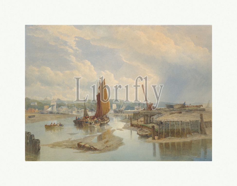 Town, Estuary, Low Tide, 1868, Watercolor, gum arabic, graphite, heightened, touches, gouache, Sheet, 17 11/16 x 24, 45 61 cm, Drawings, Edward Duncan, British, London, 1803–1882, light-filled, watercolor, describes, figures, boats, estuary, port, low tide, exposed sandbank, occupies, center foreground, wooden pilings, extending, down, water, Duncan, marine painter, watercolorist, illustrator, etchings, lithographs, studied aquatint, Robert William, Havell, established, own engraving, business