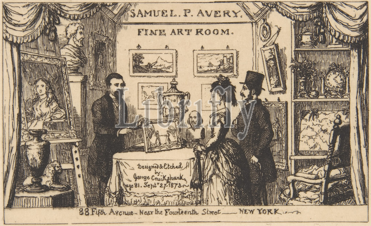 Trade card for Samuel P. Avery Fine Art Room, 1873, Etching, sheet: 6 1/4 x 9 1/2 in. (15.9 x 24.1 cm), Prints, George Cruikshank (British, London 1792–1878 London)