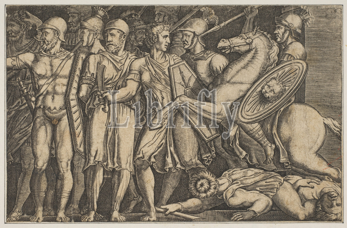 Trajan Fighting, Dacians, Trajan, horseback, right riding towards, group, soldiers, left, trampling two men, ca, 1515–1600, Engraving, Sheet, Trimmed, 3 1/4, 5 1/16, 8.3, 12.8 cm, Prints, Anonymous, Italian, 16th to early 17th century, After Marco Dente, Ravenna, active by, 1515–died, 1527, Rome