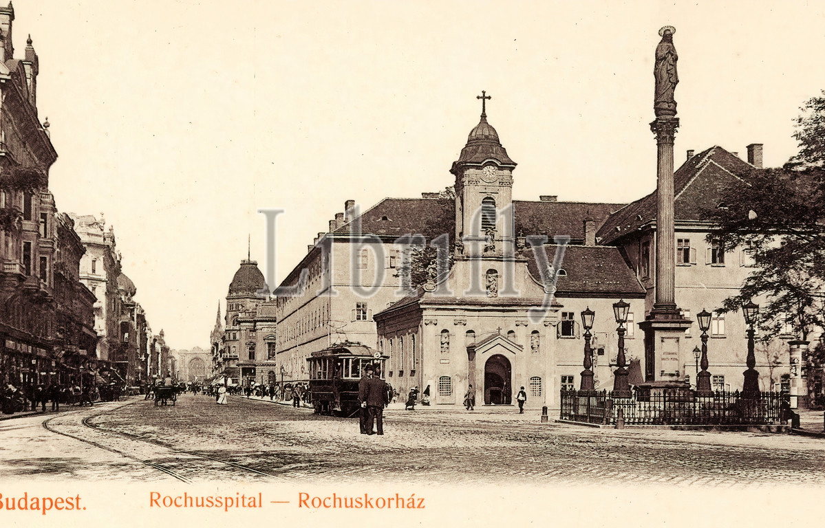 Trams in Budapest, Immaculata column and statue by Johann Halbig, Saint Roch Hospital in Budapest, Saint Roch Chapel, Budapest, 1905, Rochusspital mit Straßenbahn, Hungary