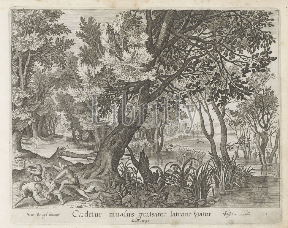 Traveler, attacked, robbers, series title, wooded river landscape, traveler, assaulted, three robbers, boats, anchored, distance, Bible story, Luc, 10, 25-37, print, part, album, parable, good Samaritan, forest, wood, 1646, paper, engraving