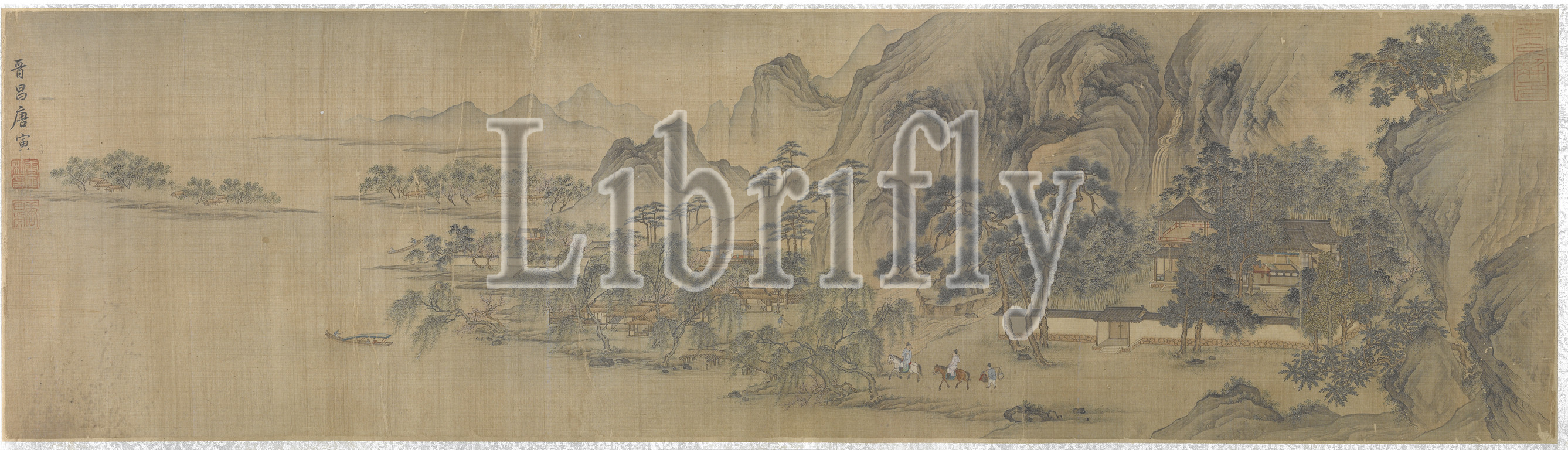 travellers, riverside village, Tang Yin, Chinese, 1470-1524, Qing dynasty, ink, color, silk, 12 x 43-1/8, image, 13-7/8 x 117-1/8, mount, Asian Art