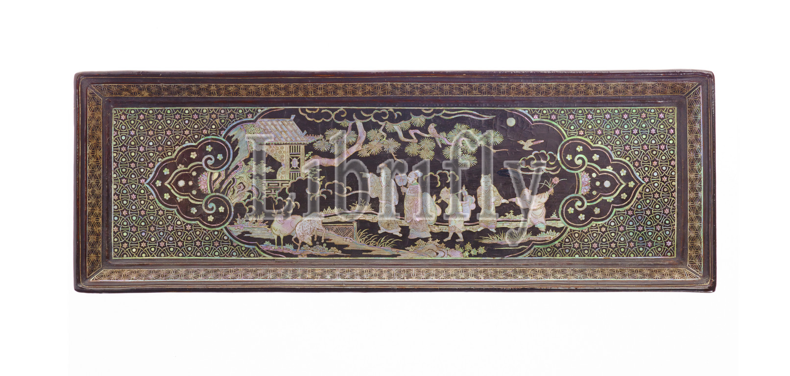 tray, figures, Ming dynasty, 1500, mother-of-pearl inlay, black lacquer, wood, 14-1/4 x 5, Asian Art