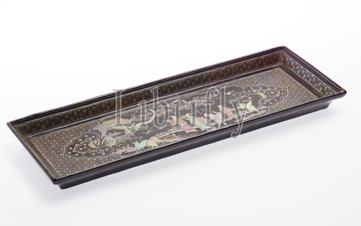 tray with figures, Ming dynasty, Ming dynasty, about 1500, mother-of-pearl inlay, black lacquer, wood, 14-1/4 x 5 in., Asian Art