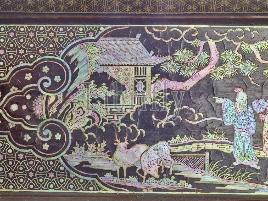 tray, figures, Ming dynasty, 1500, mother-of-pearl inlay, black lacquer, wood, 14-1/4 x 5, Asian Art