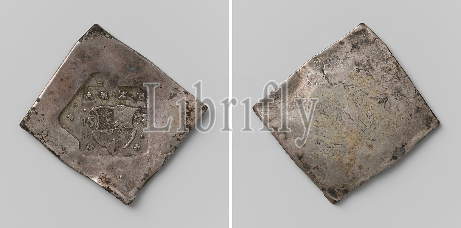 Treaty of Passau, emergency currency of Albert, margrave of Brandenburg-Kulmbach, almost diamond shaped emergency currency. Front: two rectangular stamps that are largely overlapped: coat of arms under letters A, M, Z and B between years. Reverse: private label, Peace of Passau, Passau, Albert (Margrave of Brandenburg-Kulmbach), anonymous, Germany, 1553, silver (metal), engraving, h 5 cm × w 5.1 cm × w 28.88 gr