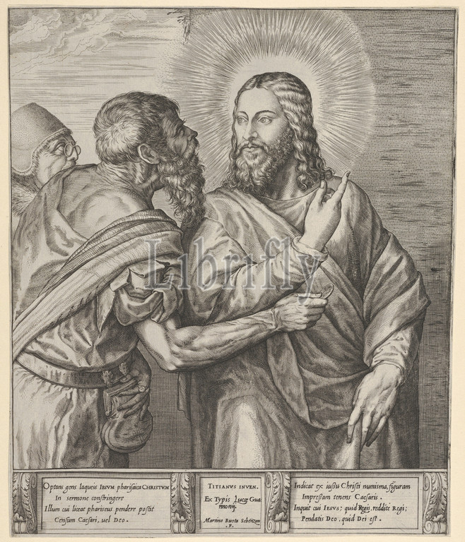 Tribute Money, two Pharisees, holding out, coin, right hand, approach Christ, left, ca, 1560–68, Engraving, sheet, 10 15/16 x 9 1/4, 27.8 23.5 cm, Prints, Martino Rota, Italian, ca., 1520–1583, active Venice, Graz, Vienna and Prague, After Titian, Tiziano Vecellio, Pieve di Cadore ca., 1485/90?–1576, Venice