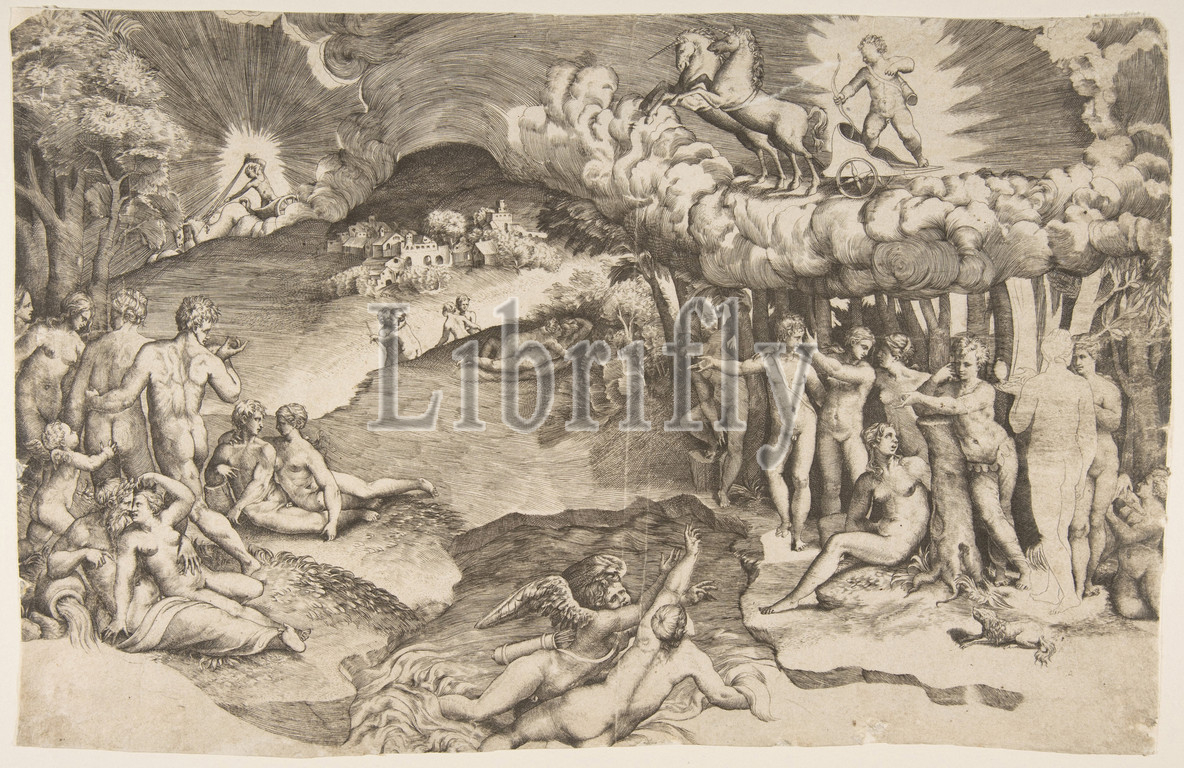 The triumph of love, cupid riding a chariot drawn by unicorn is in the upper right, naked figures fill the composition; a proof impression, 1545, Engraving, sheet: 10 1/4 x 15 7/8 in. (26 x 40.4 cm), Prints, Giulio Bonasone (Italian, active Rome and Bologna, 1531–after 1576), This is a proof impression with some figures in outline and shading incomplete, before Bonasone's name, the date 1545 and the publisher's name Tommaso Barlacchi were added.