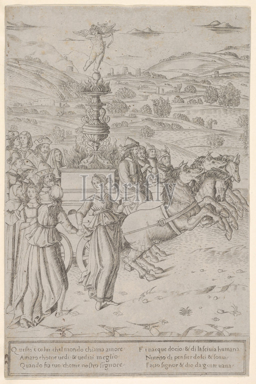 Triumph, Love, Triumphs, Petrarch, 1480–1500, Engraving, first state, two, Bartsch, sheet, 10 5/16 x 6 3/4, 26.2 17.2 cm, Prints, Francesco Rosselli, Florence, 1448–1508/27 Venice, representation, conquest, based, poem, illustrated, manuscript illuminations, paintings, four, series, engravings