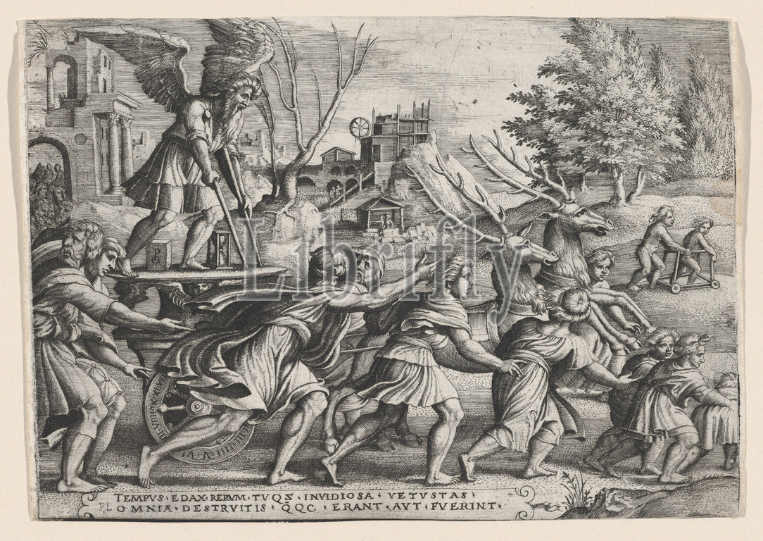 The Triumph of Time on Fame, from The Triumphs of Petrarch, Engraving, Sheet: 5 1/2 × 8 3/8 in. (13.9 × 21.3 cm), Prints, Georg Pencz (German, Wroclaw ca. 1500–1550 Leipzig)