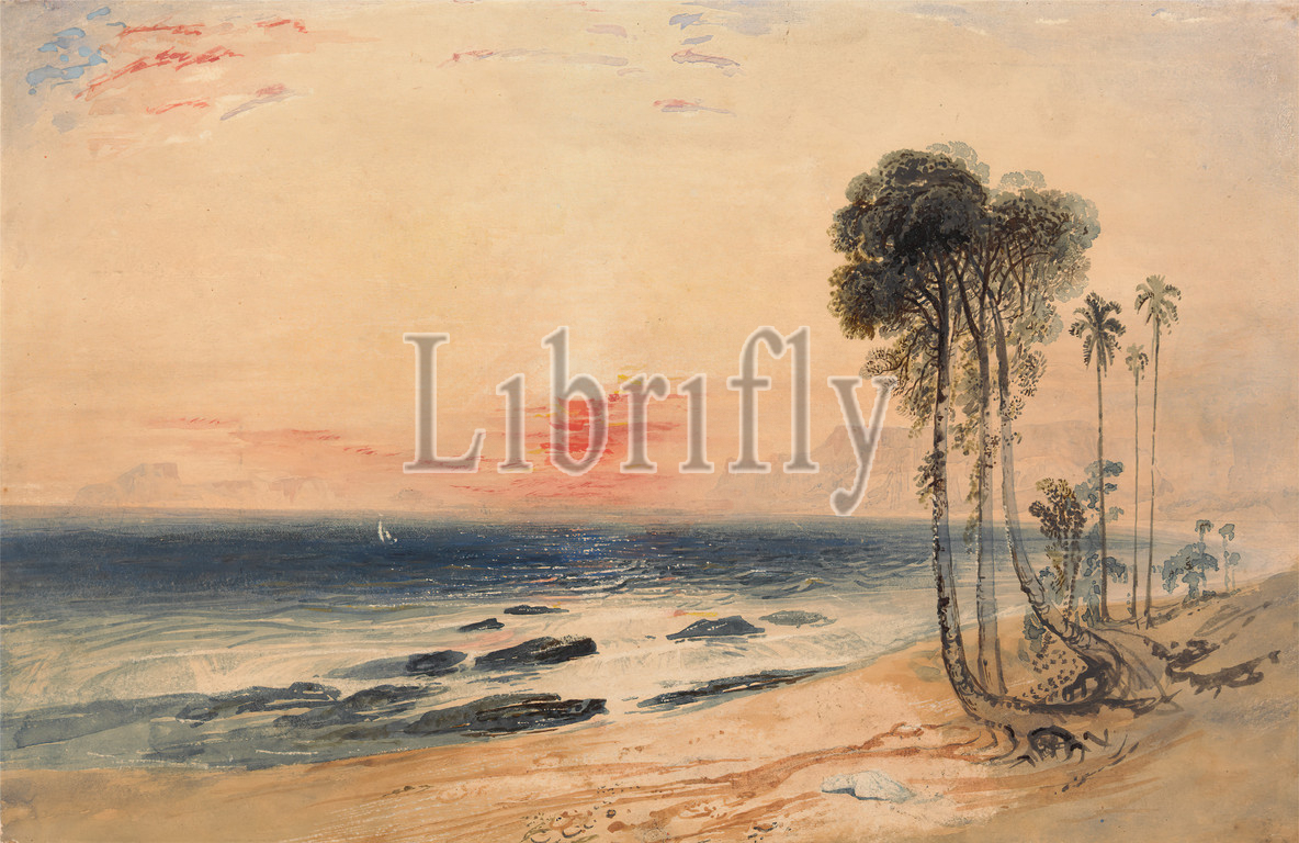 Tropical Coast, Sunset, John Martin, 1789–1854, British, 1840, 1850, Watercolor, gouache, brown ink, graphite, scratching out, moderately thick, slightly textured, beige wove paper, Sheet, beach, coast, landscape, palm trees, sailboat, sea, shore, landform, sunset, tropical climate, waves, natural events