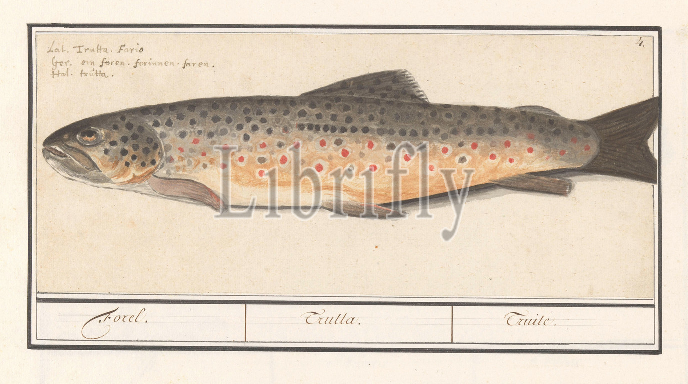 Trout (Salmo trutta), Trout. / Trutta. / Truile. (title on object), Trout. Numbered top right: 4. Top left the name in three languages. Part of the sixth album with drawings of fish, shells and insects. Sixth of twelve albums with drawings of animals, birds and plants known around 1600, commissioned by Emperor Rudolf II. With explanations in Dutch, Latin and French, Anselmus Boetius de Boodt, 1596 - 1610, paper, pencil, chalk, watercolor (paint), deck paint, ink, pen, h 129 mm × w 304 mm