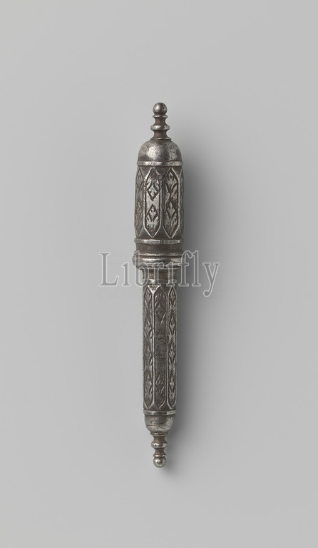 Tube, A forged iron octagonal needle case with screw-on lid adorned by engraving with leaf ornament., anonymous, England (possibly), 1700 - 1800, iron (metal), forging, h 8.5 cm × d 1.1 cm