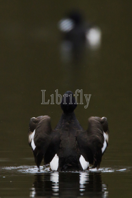 Tufted Duck stretching wings, Aythya fuligula, Netherlands