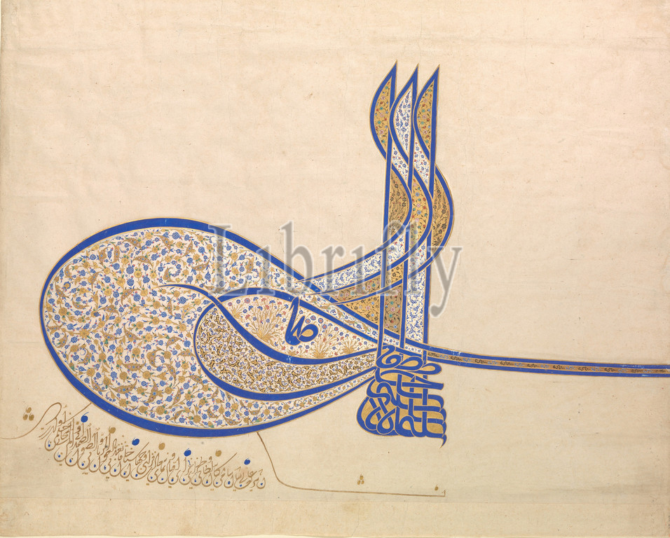 Tughra, Official Signature, Sultan Süleiman, Magnificent, r, 1520–66, ca, 1555–60, Turkey, Istanbul, Ink, opaque watercolor, gold, paper, H, 20 1/2, 52.1 cm, Codices, Ottoman, tughra, calligraphic emblem, sultan, authority, included, official documents, firmans, royal decrees, endowment papers, correspondence, coins, first Ottoman, 1324, later developed, complex form, included three, vertical, shafts, two concentric, oval, loops, left