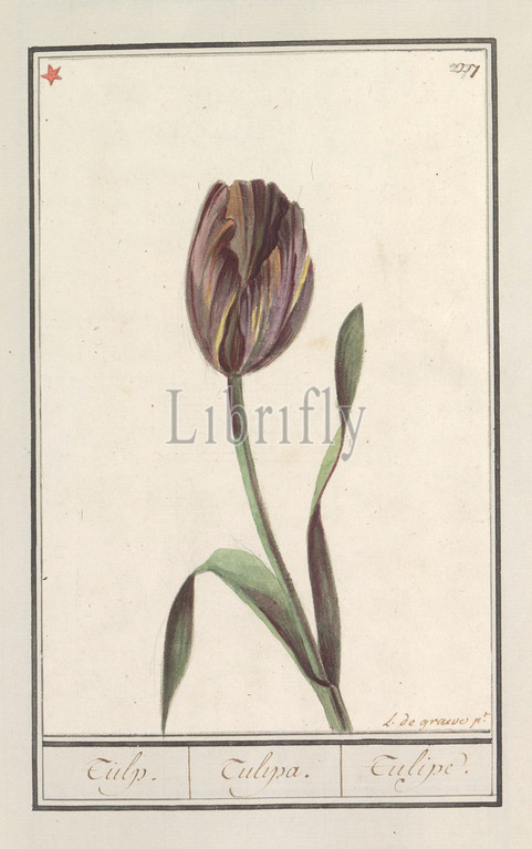 Tulip (Tulipa), Tulip. / Tulipa. / Tulipe. (title on object), Dark purple-yellow tulip. Numbered top right: 27. Top left marked with a red star. Part of the first album with drawings of flowers and plants. Eighth of twelve albums with drawings of animals, birds and plants known around 1600, commissioned by Emperor Rudolf II. With explanation in Dutch, Latin and French, flowers: tulip, Louis De Graeve (mentioned on object), Bruges, 1790 - 1814, paper, watercolor (paint), deck paint, pencil, brush, h 233 mm × w 153 mm