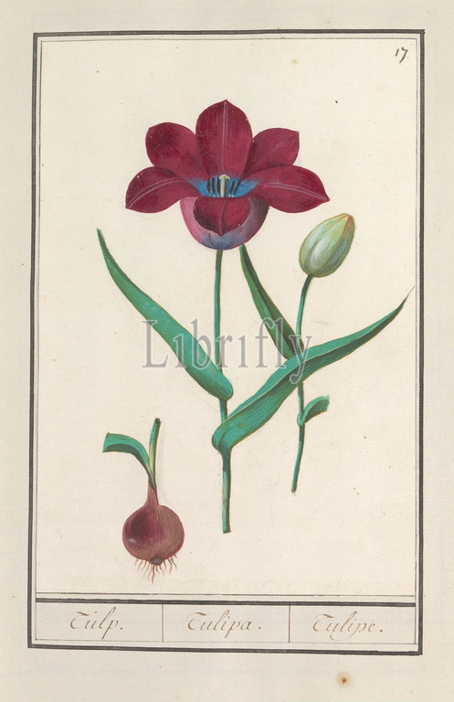 Tulip (Tulipa), Tulip. / Tulipa. / Tulipe. (title on object), Dark red tulip, bud and bulb. Numbered top right: 17. Part of the first album with drawings of flowers and plants. Eighth of twelve albums with drawings of animals, birds and plants known around 1600, commissioned by Emperor Rudolf II. With explanations in Dutch, Latin and French, flowers: tulip, Anselmus Boetius de Boodt, 1596 - 1610, paper, watercolor (paint), deck paint, chalk, brush, h 241 mm × w 165 mm