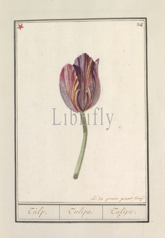 Tulip (Tulipa), Tulip. / Tulipa. / Tulipe. (title on object), Dark red-yellow tulip. Numbered top right: 24. Top left marked with a red star. Part of the first album with drawings of flowers and plants. Eighth of twelve albums with drawings of animals, birds and plants known around 1600, commissioned by Emperor Rudolf II. With explanation in Dutch, Latin and French, flowers: tulip, Louis De Graeve (mentioned on object), Bruges, 1790 - 1814, paper, watercolor (paint), deck paint, pencil, brush, h 233 mm × w 164 mm