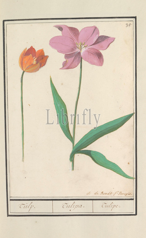 Tulip, Tulipa, Tulipe, title, object, orange, pink tulip, Numbered top right, 35, Part, first album, drawings, flowers, plants, Eighth, twelve albums, animals, birds, 1600, commissioned, Emperor Rudolf II, explanation, Dutch, Latin, French, tulip, Anselmus Boetius de Boodt, mentioned, 1596, 1610, paper, watercolor, paint, deck paint, chalk, brush