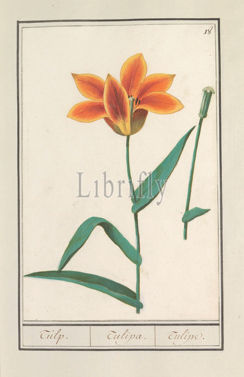 Tulip (Tulipa), Tulip. / Tulipa. / Tulipe. (title on object), Orange-yellow tulip, with seed box. Numbered top right: 18. Part of the first album with drawings of flowers and plants. Eighth of twelve albums with drawings of animals, birds and plants known around 1600, commissioned by Emperor Rudolf II. With explanations in Dutch, Latin and French, flowers: tulip, Anselmus Boetius de Boodt, 1596 - 1610, paper, watercolor (paint), deck paint, chalk, brush, h 258 mm × w 170 mm