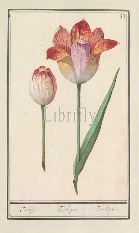 Tulip, Tulipa, Tulipe, title, object, White-red, red-yellow-pink tulip, Numbered top right, 43, Part, first album, drawings, flowers, plants, Eighth, twelve albums, animals, birds, 1600, commissioned, Emperor Rudolf II, explanation, Dutch, Latin, French, tulip, Anselmus Boetius de Boodt, 1596, 1610, paper, watercolor, paint, deck paint, chalk, brush