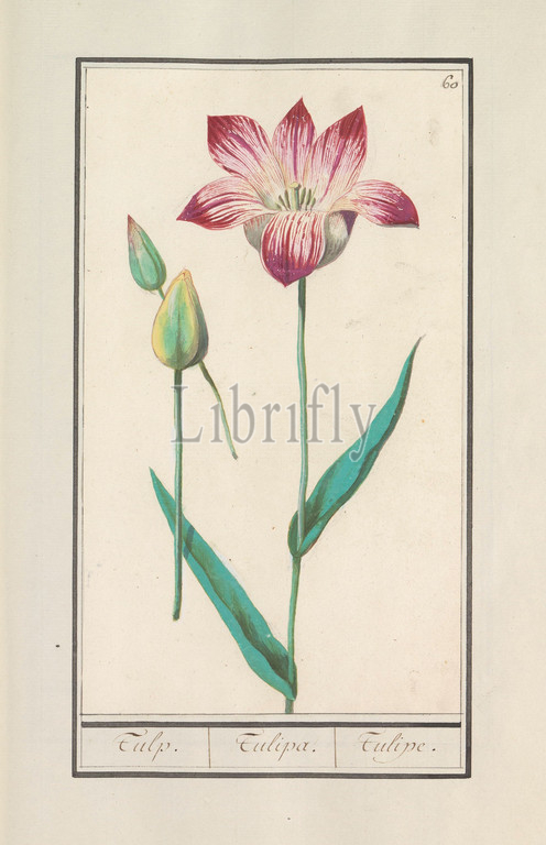 Tulip, Tulipa, Tulp, Tulipe, title, object, red, white tulip, two buds, Numbered top right, 60, Part, first album, drawings, flowers, plants, Eighth, twelve albums, animals, birds, 1600, commissioned, Emperor Rudolf II, explanation, Dutch, Latin, French, tulip, Anselmus Boetius de Boodt, 1596, 1610, paper, watercolor, paint, deck paint, chalk, brush