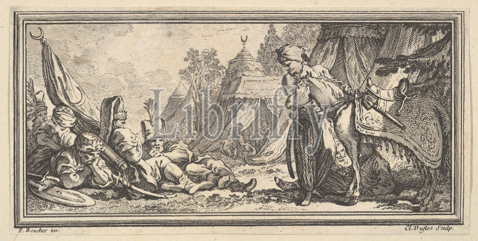 Turkish Soldiers Resting, 1746–47, Etching, engraving, Sheet, trimmed, 2 5/8, 5 1/4, 6.6, 13.4 cm, Prints, Claude Augustin Duflos le Jeune, French, Paris, 1700–1786, After François Boucher, 1703–1770
