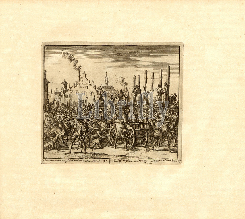 Twelve people decapitated and burned in Deventer, Anno 1571, Parallel Title: Twelve Persons Deventer Spent and Entangled, A nn o 1571, copperplate engraving, 89.), p. 187, Luyken, Jan (inv. et fec.), Jan Luyken: Théâtre des martyrs: depuis la mort de J.Christ jusqu'à present: représenté en très belles tailles-douces = Schau-Bühne der Martyrer; gezeichnet und in Kuppfer gestochen. Leyde: chez Pierre Van der Aa, [1711]