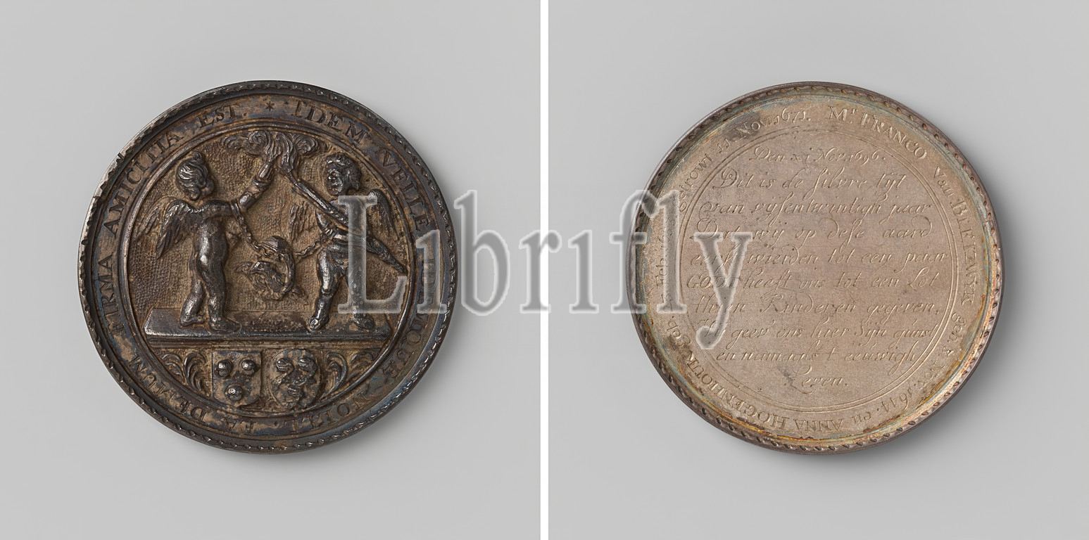 Twenty-five-year marriage of Franco van Bleizwijk and Anna Hogenhouk, Silver Medal. Front: two little angels with a torch wear a necklace together, with a ring with two pigeons in it, hanging above two coats of arms within an inscription. Reverse: inscription inside, Franco van Bleiswijck, Anna Hogenhouk, anonymous, Netherlands, 1696, silver (metal), engraving, d 5.6 cm × w 41.17 gr