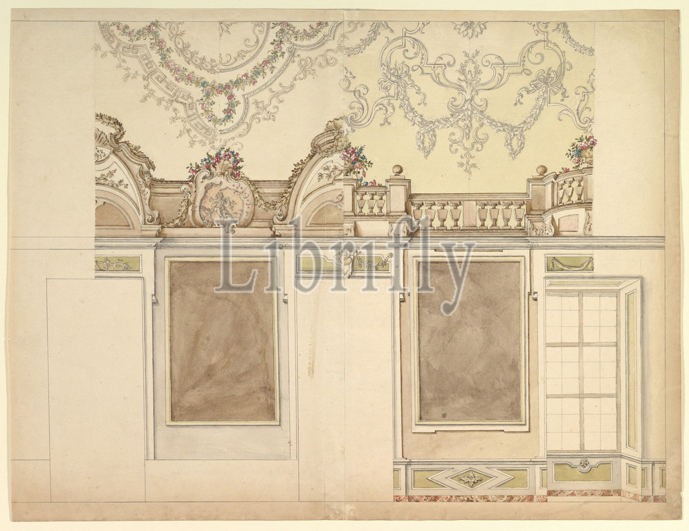Two Alternate Elevations for an Interior Wall, 1700–1780, Pen and gray ink, brush and watercolor over graphite, with ruled and compass construction, sheet: 18 1/16 x 23 9/16 in. (45.8 x 59.9 cm), Drawings, Anonymous, Italian, Piedmontese, 18th century