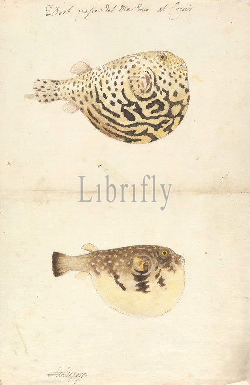 Two Blowfish, Luigi Balugani, 1737–1770, Italian, undated, Watercolor and graphite on medium, slightly textured, cream laid paper, Sheet: 13 1/2 x 9 inches (34.3 x 22.9 cm), blowing, fish