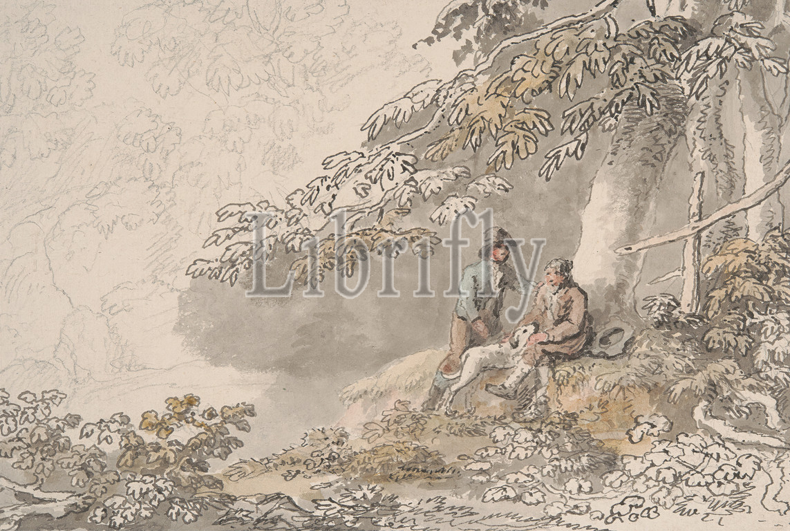 Two Boys, Dog, Wood, Anthony Devis, 1729–1817, British, Watercolor, gray wash, pen, black ink, moderately thick, slightly textured, cream wove paper, Sheet, boys, dog, animal, forest, genre subject, woods