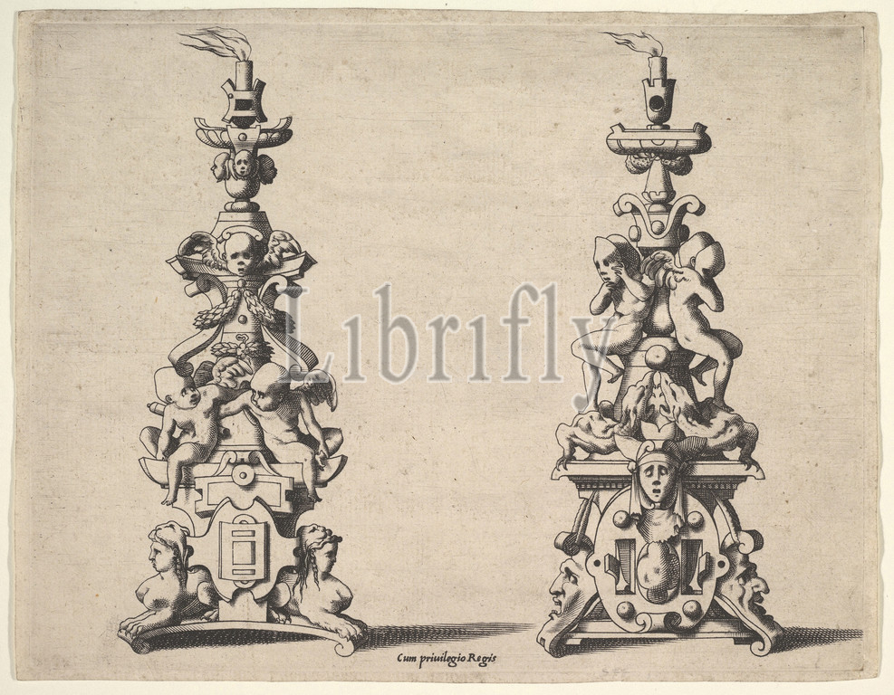 Two candlestick designs, ca. 1550–60, Engraving, plate: 5 1/2 x 7 1/16 in. (14 x 18 cm), René Boyvin (French, Angers ca. 1525–ca. 1625 Angers (?)), Possibly by Pierre Milan (French, active 1537–40), Print with two designs for candlesticks. At left, a pyramidal design composed of sphinxes, cherubs, garlands, and scrollwork; at right, a pyramidal design composed of masks, masked figures, monstrous creatures, and scrollwork; from a series of nine designs for various metalwork objects possibly after Rosso Fiorentino or Léonard Thiry