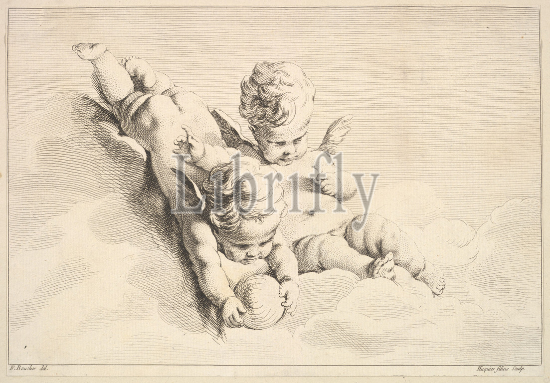 Two Cupids, Holding, Ball, mid, late 18th century, Etching, engraving, Sheet, trimmed, 7 9/16, 10 5/16, 19.2, 26.2 cm, Prints, Jacques Gabriel Huquier, French, Paris, 1730–1805, Shrewsbury, After François Boucher, 1703–1770