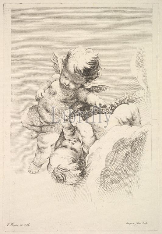 Two Cupids, Holding, Wreath, mid, late 18th century, Etching, engraving, Sheet, 18 5/16, 11 15/16, 46.5, 30.3 cm, Prints, Jacques Gabriel Huquier, French, Paris, 1730–1805, Shrewsbury, After François Boucher, 1703–1770