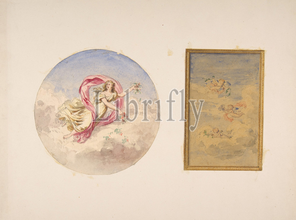 Two designs, decoration, ceilings, figures, clouds, 1830–97, graphite, watercolor, gold paint, wove papers mounted, cardboard, Drawings, Jules-Edmond-Charles Lachaise, French, died, 1897, Eugène-Pierre Gourdet, born Paris, 1820