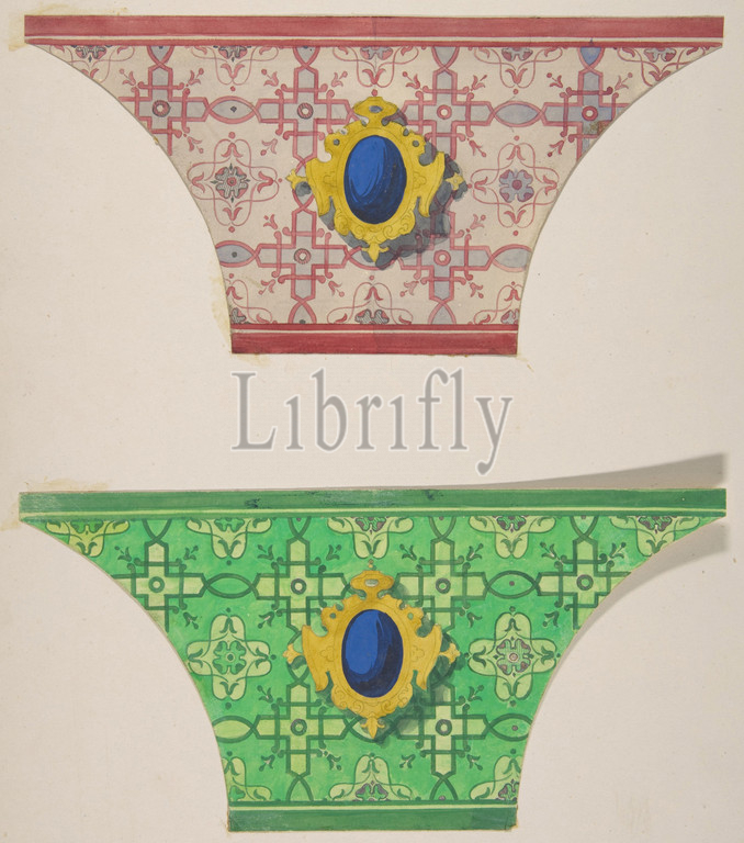 Two designs for the painted decoration of ceiling coves with cartouches, 1830–97, graphite, watercolor and gouache on wove paper; mounted on wove paper, Overall: 12 7/16 x 9 7/16 in. (31.6 x 23.9 cm), Drawings, Jules-Edmond-Charles Lachaise (French, died 1897), Eugène-Pierre Gourdet (French, born Paris, 1820)