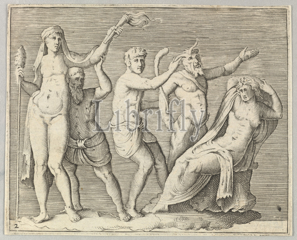 Two Figures, a Faun, and a Satyr approach a Recliniing Woman, published ca. 1599–1622, Engraving. Third state., plate: 3 7/16 x 4 7/8 in. (8.8 x 12.4 cm), Prints, Anonymous, Italian, 16th century, After Battista Franco (Italian, Venice ca. 1510–1561 Venice)