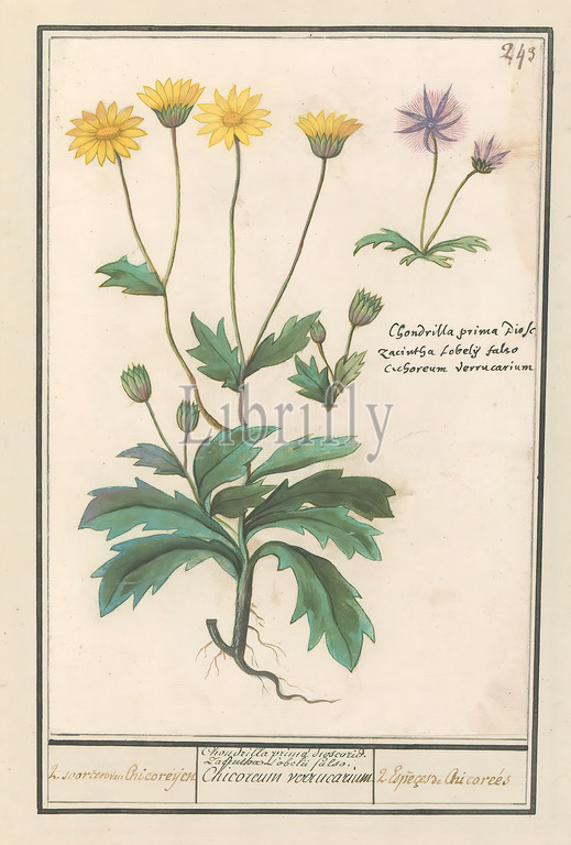 Two flowers from the composite family (Asteraceae) 2 species from Chicoreijen / Chondrilla prima dioscorid. Zacinthae Lobelii falso. Chicoreum verrucarium / 2. Espèces de Chicoré es (title on object), Two (unknown) flowers, yellow and purple, from the composite family. Chicory according to the caption. Numbered top right: 243. Right the Latin names. Part of the third album with drawings of flowers and plants. Tenth of twelve albums with drawings of animals, birds and plants known around 1600, commissioned by Emperor Rudolf II. With explanation in Dutch, Latin and French., Anselmus Boetius de Boodt, 1596 - 1610, paper, watercolor (paint), deck paint, chalk, ink, pen, h 244 mm × w 169 mm
