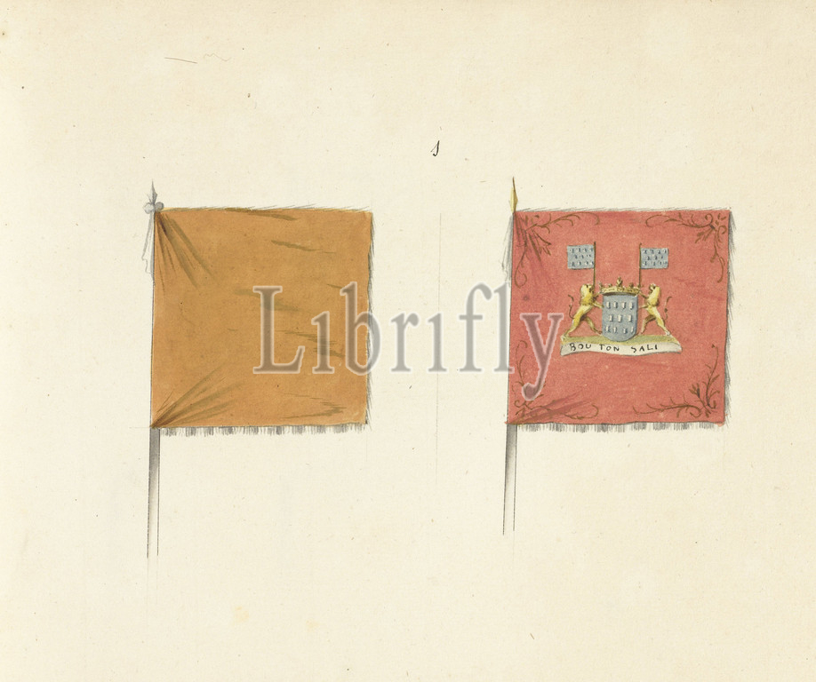 Two French banners captured, battle, Spierbach, 1703, Two French banners captured, battle, Spierbach, 1703, book, drawings, French banners, standards, timpani captured, War, Spanish Succession, 1701-1713, draughtsman, anonymous, Northern Netherlands, 1713, 1720, paper, drawing, height 172 mm, width 230 mm