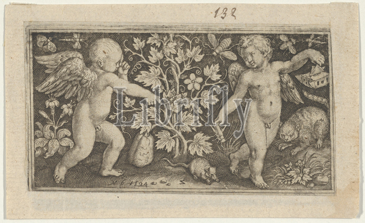 Two Genii, Cat, Rat, 1594, Engraving, Sheet, 2 3/8, 3 7/8, 6, 9.8 cm, Nicolaes de Bruyn, Netherlandish, Antwerp, 1571–1656, Rotterdam, putti, landscape, plant growing, center, rat, right, putto holding, grasshopper, right hand, cat, far right, series, six plates