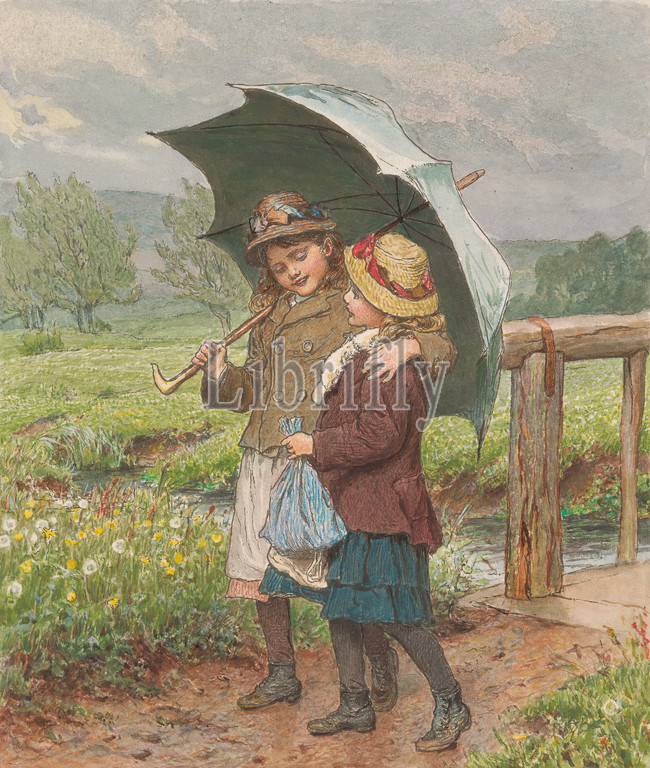 Two Girls Under, Umbrella, Print, Robert Barnes, 1840–1895, British, Robert Barnes, 1840–1895, British, Wood-engraving, watercolor, moderately thick, slightly textured, cream card mounted, moderately thick, slightly textured, beige wove paper, Mount, Sheet, Image, bags, bridge, built work, children, coats, embracing, flowers, plants, friends, genre subject, girls, grass, hats, landscape, laughing, path, rainfall, river, siblings, sisters, smiling, stream, talking, trees, umbrella, walking