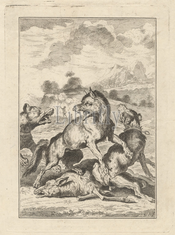 Two hunting dogs, a wolf and a sheep, a Pl. for 'A New Drawing Book..of Beasts in Various Actions' (1 of 9), Print made by George Bickham, 1683/4–1758, British, after unknown artist, Published by Henry Overton, 1675/6–1751, British, undated, Etching on medium, smooth, cream laid paper, Sheet: 11 7/8 x 7 3/8 inches (30.2 x 18.7 cm), Plate: 8 3/8 x 6 1/8 inches (21.3 x 15.5 cm), and Image: 7 3/8 x 5 inches (18.7 x 12.7 cm), animal art, claws, clouds, collars, dogs (animals), fighting, hunters, hunting dogs, landscape, mountains, sheep, soldiers, sporting art, teeth, trees, wolf