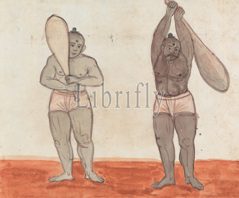 Two Jeyties Weightlifting, Gangaram Chintaman Tambat, active 1790s, Anglo-Indian, Watercolor, white gouache, graphite, medium, slightly textured, cream laid paper, Sheet