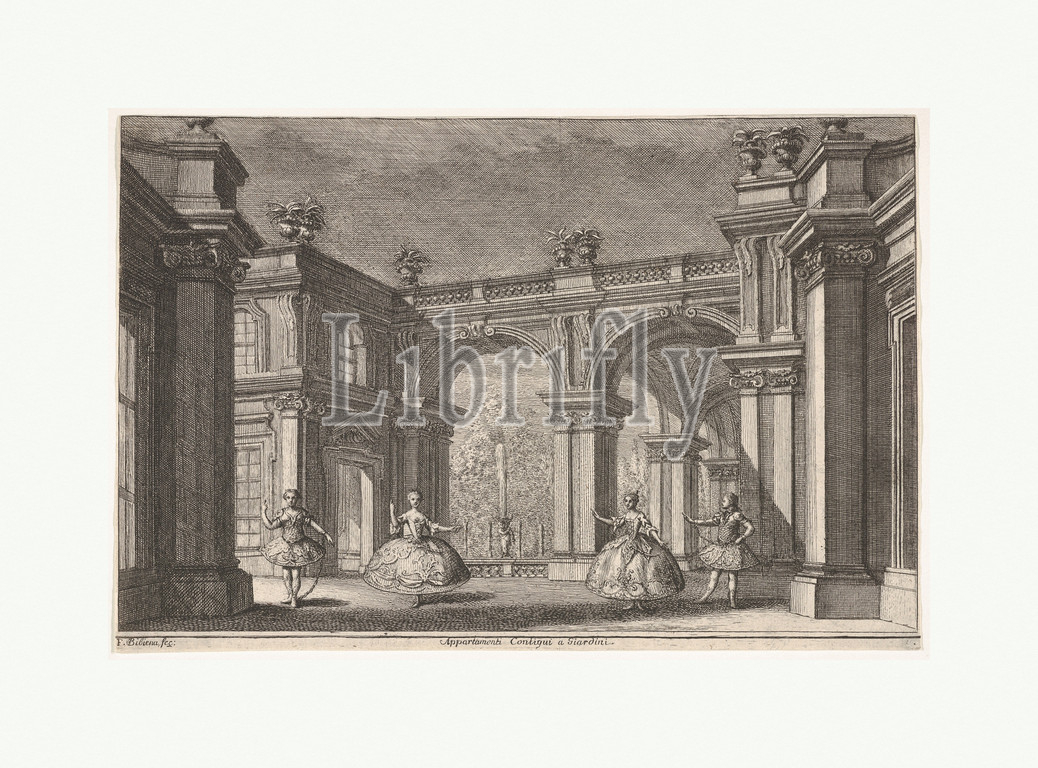 Two ladies, two gentlemen dancing within, ornate architectural setting, fountain, center, background, scene, Talestri, Regina delle Amazzoni, 1765, Engraving, sheet, 6 7/8 x 10 5/16, 17.5 26.2 cm