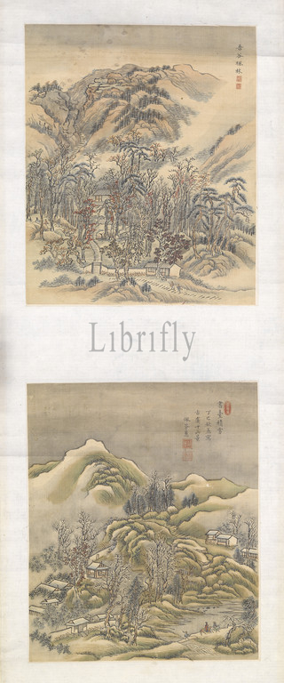 two landscape album leaves, single mount, Xue Hui, Chinese, Qing dynasty, period, Jiaqing, 1817, ink, color, silk, 47-1/4 x 13-1/8, overall, 28-1/2 x 10-3/8, image, signed, Peifen Hui seals, Peifen, Asian Art