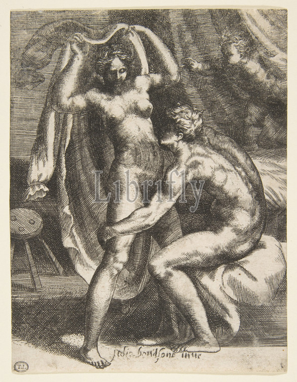 Two lovers, a man pulling a woman toward a bed, from 'The Loves of the Gods', 1531–60, Engraving, sheet: 5 1/2 x 4 3/16 in. (14 x 10.7 cm), Prints, Giulio Bonasone (Italian, active Rome and Bologna, 1531–after 1576)