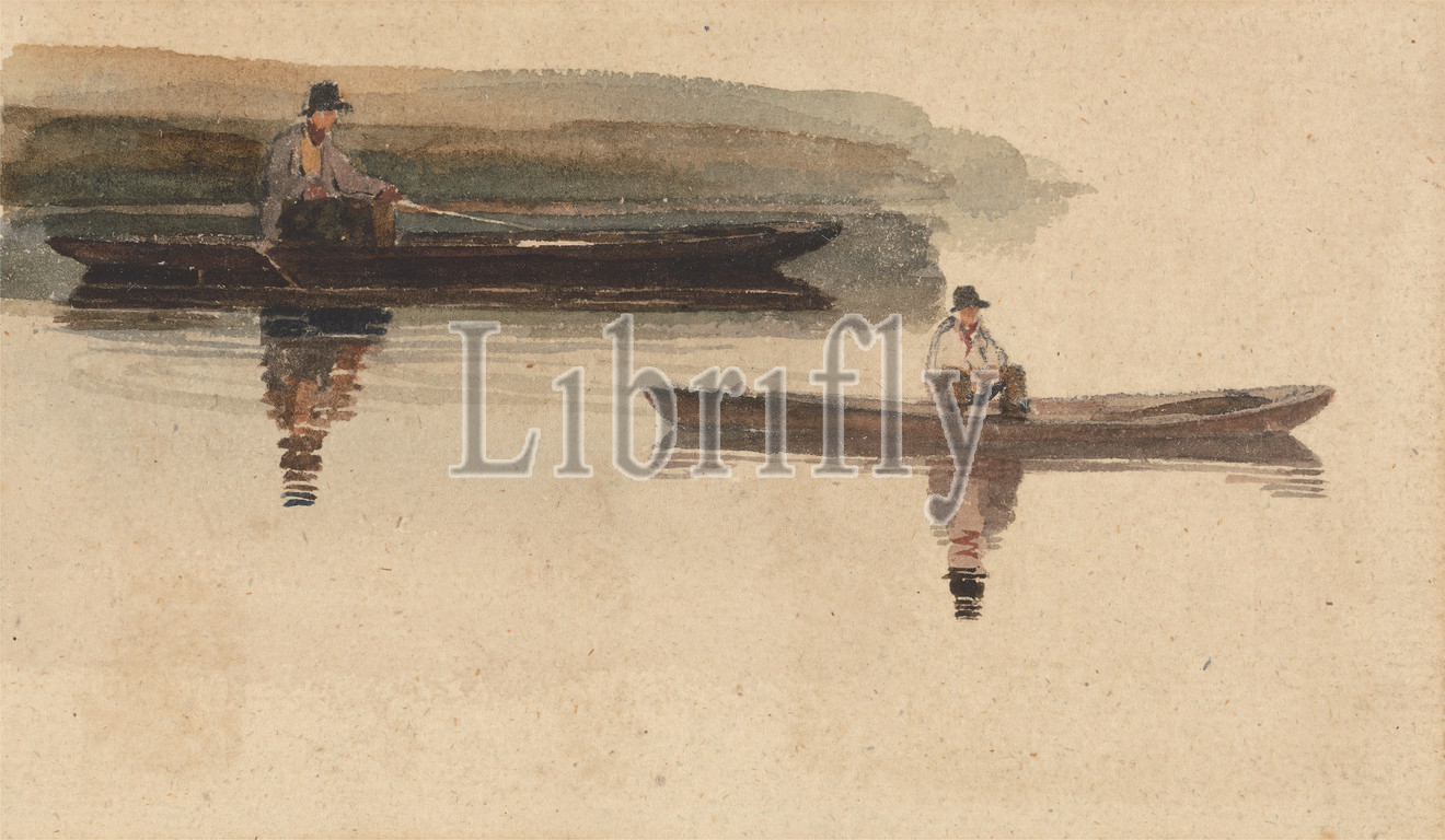 Two Men, Punts, attributed, Peter DeWint, 1784–1849, British, Watercolor, graphite, moderately thick, moderately textured, cream wove paper, Sheet, boats, fishermen, fishing, genre subject, hats, men, punts, river