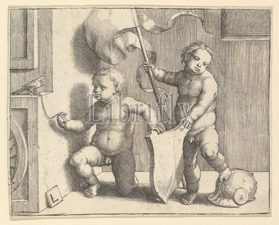 Two Nude Children Supporting, Blank Shield, ca, 1510, Engraving, sheet, 3 5/16 x 4 3/16, 8.4 10.6 cm, Prints, Lucas van Leyden, Netherlandish, Leiden ca., 1494–1533, Leiden