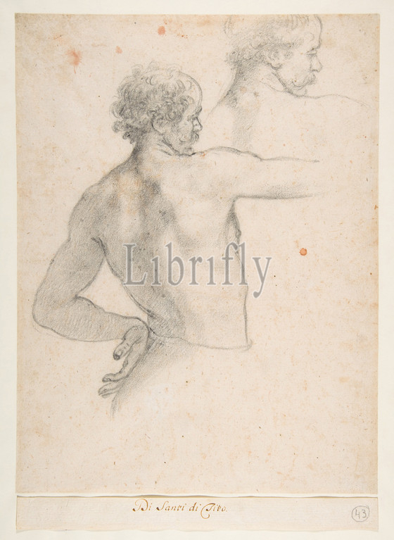 Two Studies, Man, ca, 1575, Black chalk, recto, rulings, red, black, early collector, verso, sheet, 13 3/4 x 6 7/8, 35 17.5 cm, Drawings, Santi di Tito, Italian, Sansepolcro, 1536–1603, Florence, pupil, Bronzino, Alessandro Allori, di, Tito, founders, 1563, Florentine Accademia, del, Disegno, Academy, Drawing, leading role, generation, late-sixteenth-century Tuscan, painters, turned, practice, carefully observed, life, drawing, direct, pictorial language, away, abstract Mannerist, vocabulary, greater naturalism